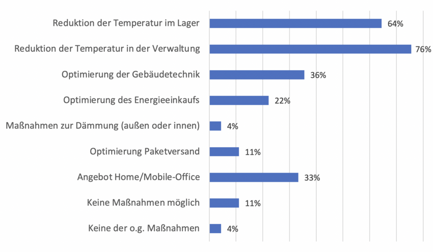 Am stärksten wirken sich die Energiekosten im Betrieb der Immobilien und Arbeitsflächen aus – dies gaben 40 Prozent der teilnehmenden Unternehmen als wichtigsten Kostentreiber an. An zweiter Stelle liegen die Inbound-Frachtkosten (34 Prozent Nennung als am stärksten von Energiekostensteigerungen betroffen), wohingegen die Zustellung nur von knapp 7 Prozent der Befragten als Haupttreiber wahrgenommen wird. Lagerung und Versandvorbereitung stellen nur bei gut 9 Prozent der Befragten den am stärksten von steigenden Energiekosten betroffenen Bereich dar. Der Betrieb der internen IT (4,6 Prozent) und Energiekostensteigerungen, die von externen Software- und IT-Partnern weitergereicht werden (2,3 Prozent) sind nur kleine Kostentreiber. Allerdings, so die Kommentare der Befragten, ist der „Cocktail“ an Kostensteigerungen in allen Bereichen das Hauptproblem.